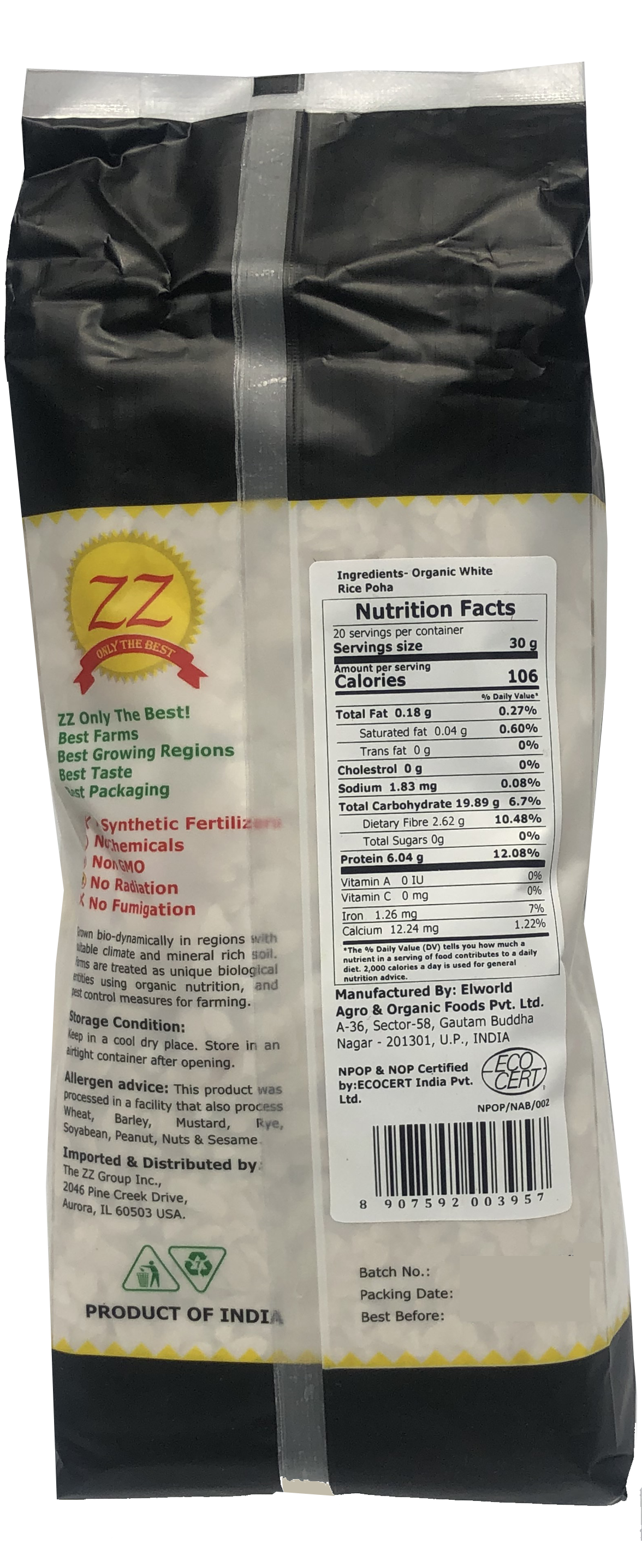ZZ Organic uses the best-sourced paddy to bring you a great-tasting and nutritious snack. It is high in Fibre which promotes digestive health. It is the source of protein. Enjoy a deliciously wholesome and healthy snack with ZZ Organic white rice poha.